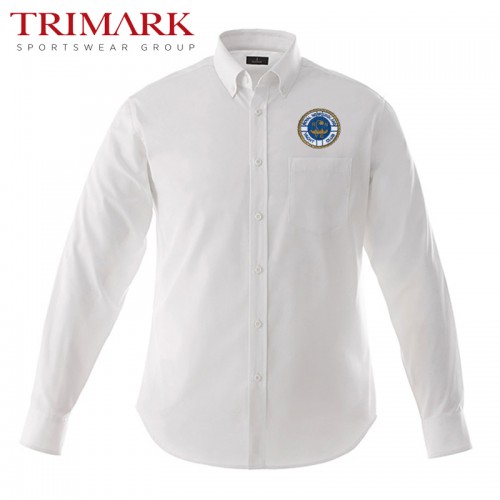 Trimark mens Wiltshire white classic woven dress shirt with three-colour stiched Royal Newfoundland Yacht Club emblem. Features button-down collar, left chest pocket, and centre back box pleat.
